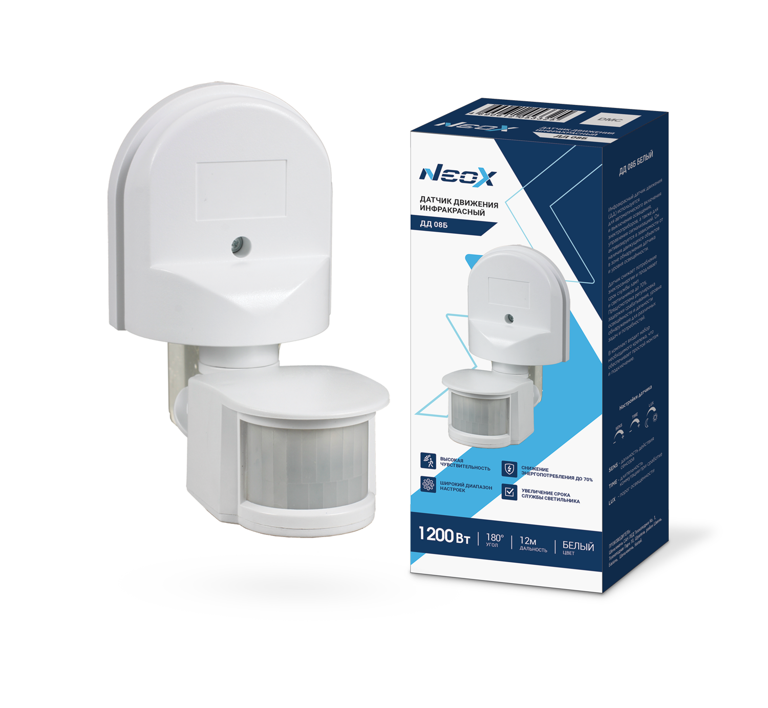 Датчик движения инфракрасный ДД 08Б 1200Вт 180 гр.12м IP44 белый NEOX