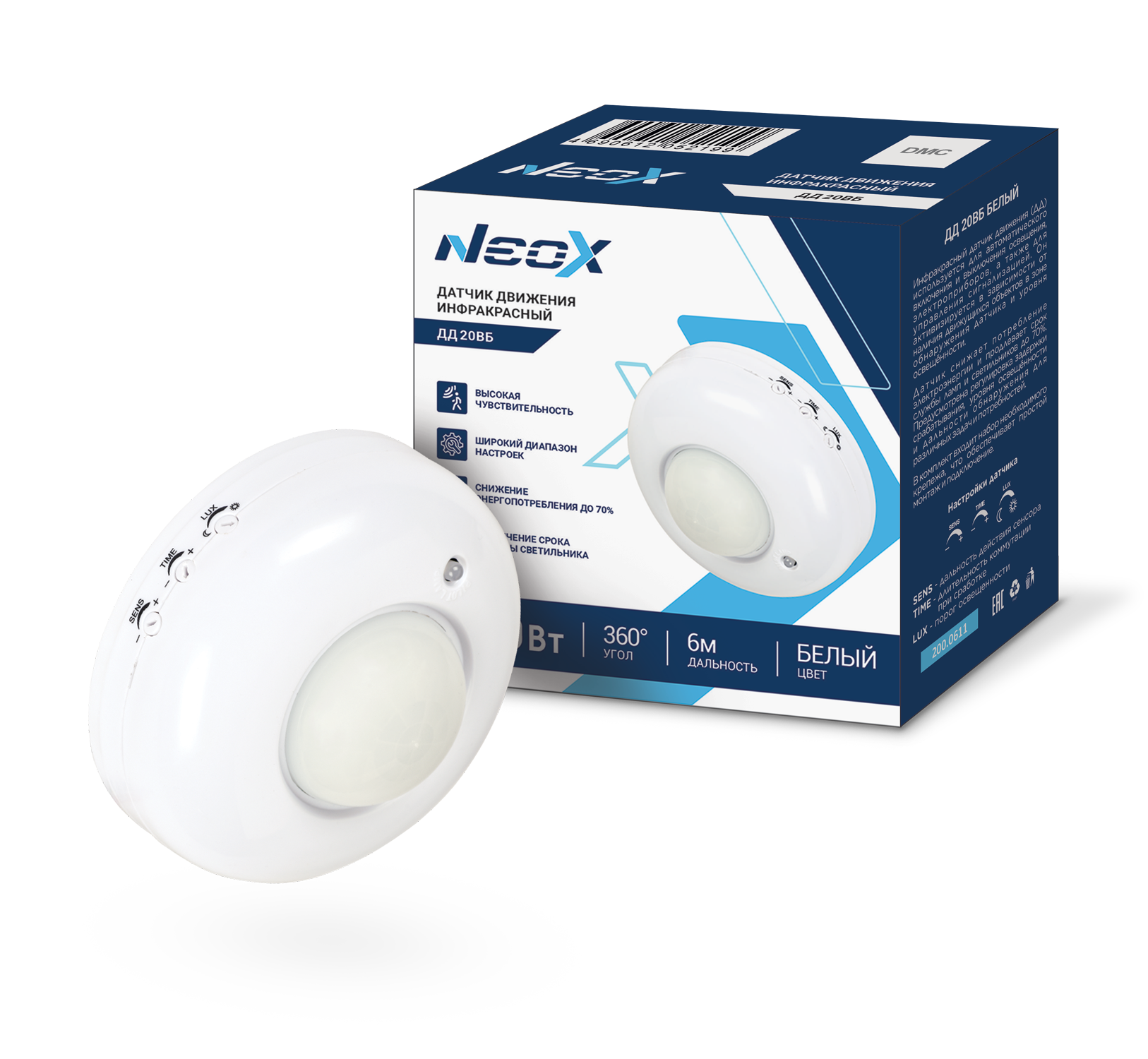 Датчик движения инфракрасный ДД 20BБ 1200Вт 360 гр. 6м IP33 белый NEOX