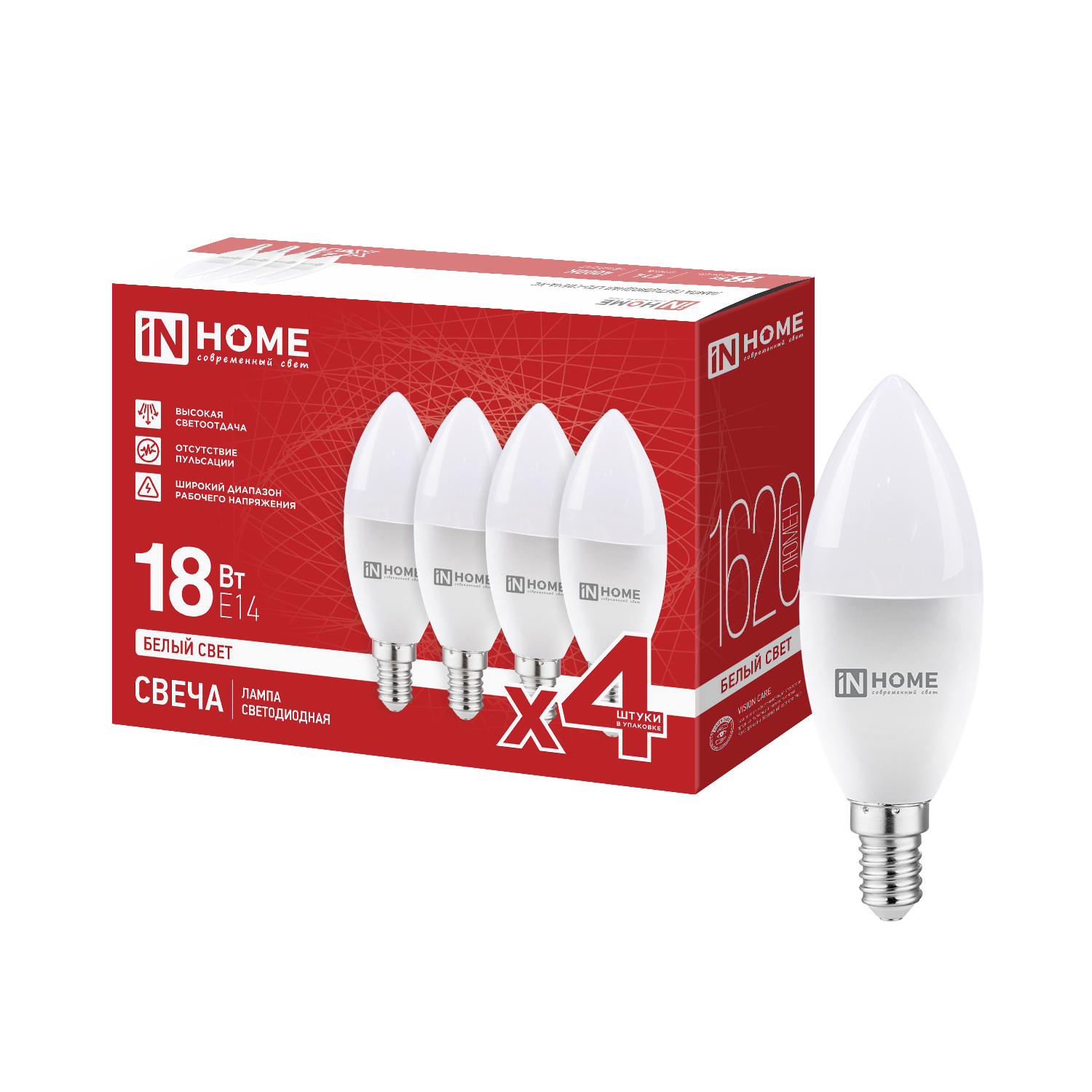 Лампа светодиодная LED-СВЕЧА-VC 4PACK 18Вт 230В Е14 4000К 1620Лм (4шт./упак) IN HOME