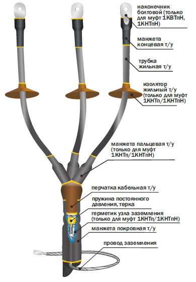 Монтаж муфты производится на разделке кабеля методом термоусаживания основных деталей из модифицированного полимера, входящих в комплект муфты, с помощью горелки или высокотемпературного фена. Муфта оснащена жильными антитрекинговыми изоляторами, которые создают на поверхности сухие зоны и увеличивают длину путей токов утечки.