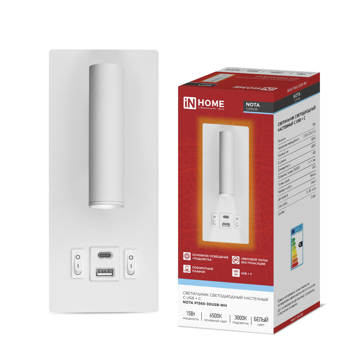 Светильник светодиодный NOTA P1565-30USB-WH 15Вт 6500К с подсветкой 3000К USB type C белый IN HOME