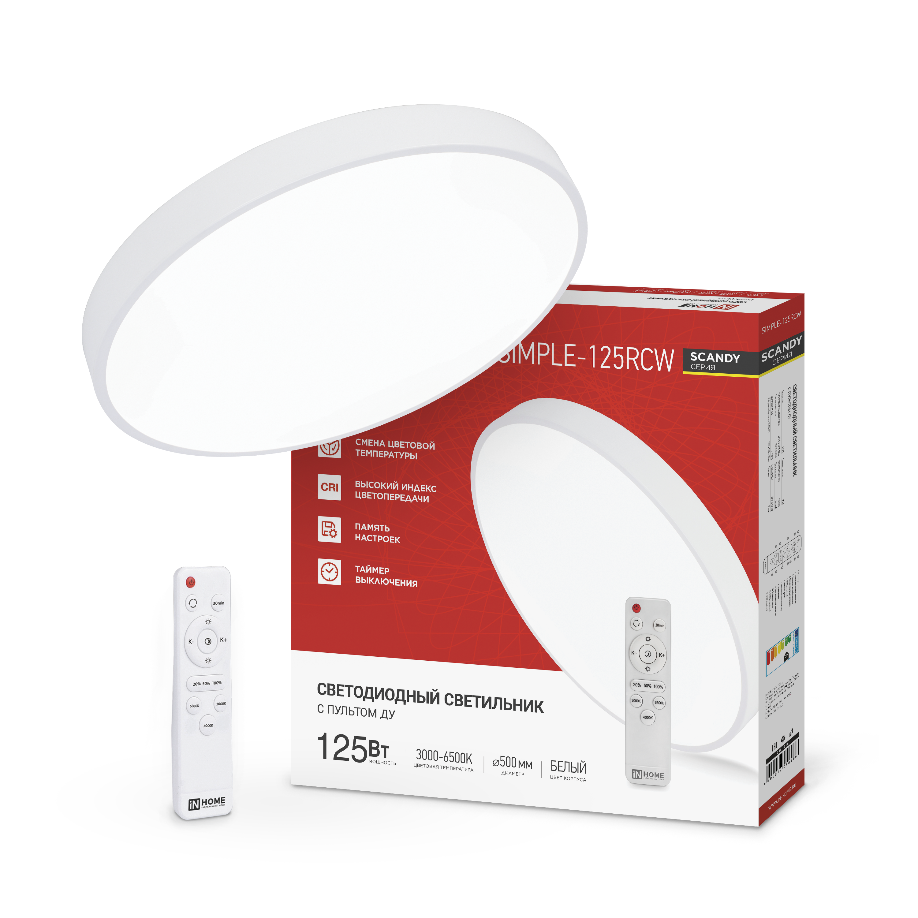Светильник светодиодный SCANDY SIMPLE-125RCW 125Вт 230В 3000-6500K 10000Лм 500x50мм с пультом ДУ белый IN HOME