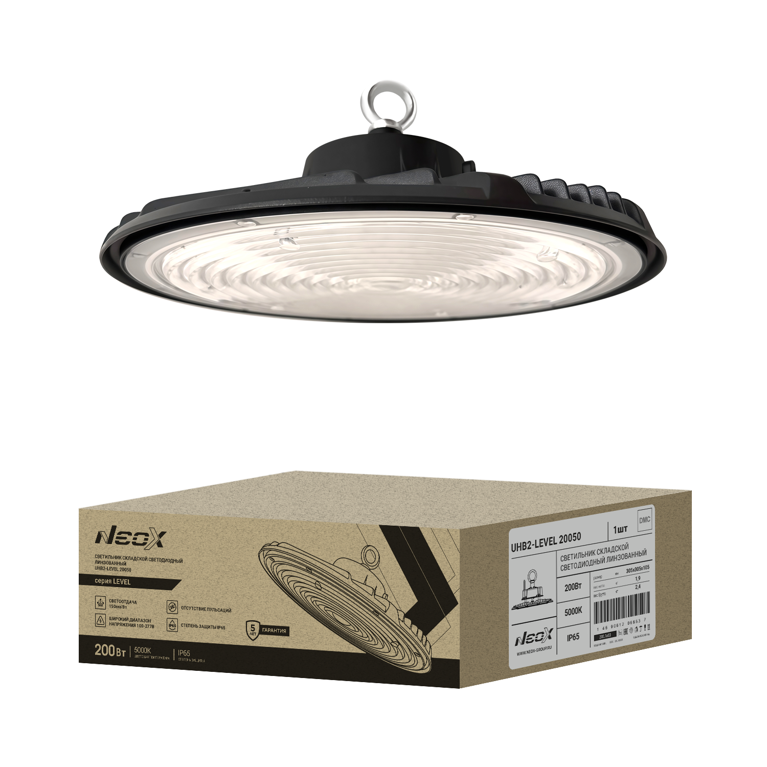 Светодиодный складской светильник NEOX UHB2-LEVEL 200Вт предназначен для освещения больших промышленных и складских помещений с высокими потолками.