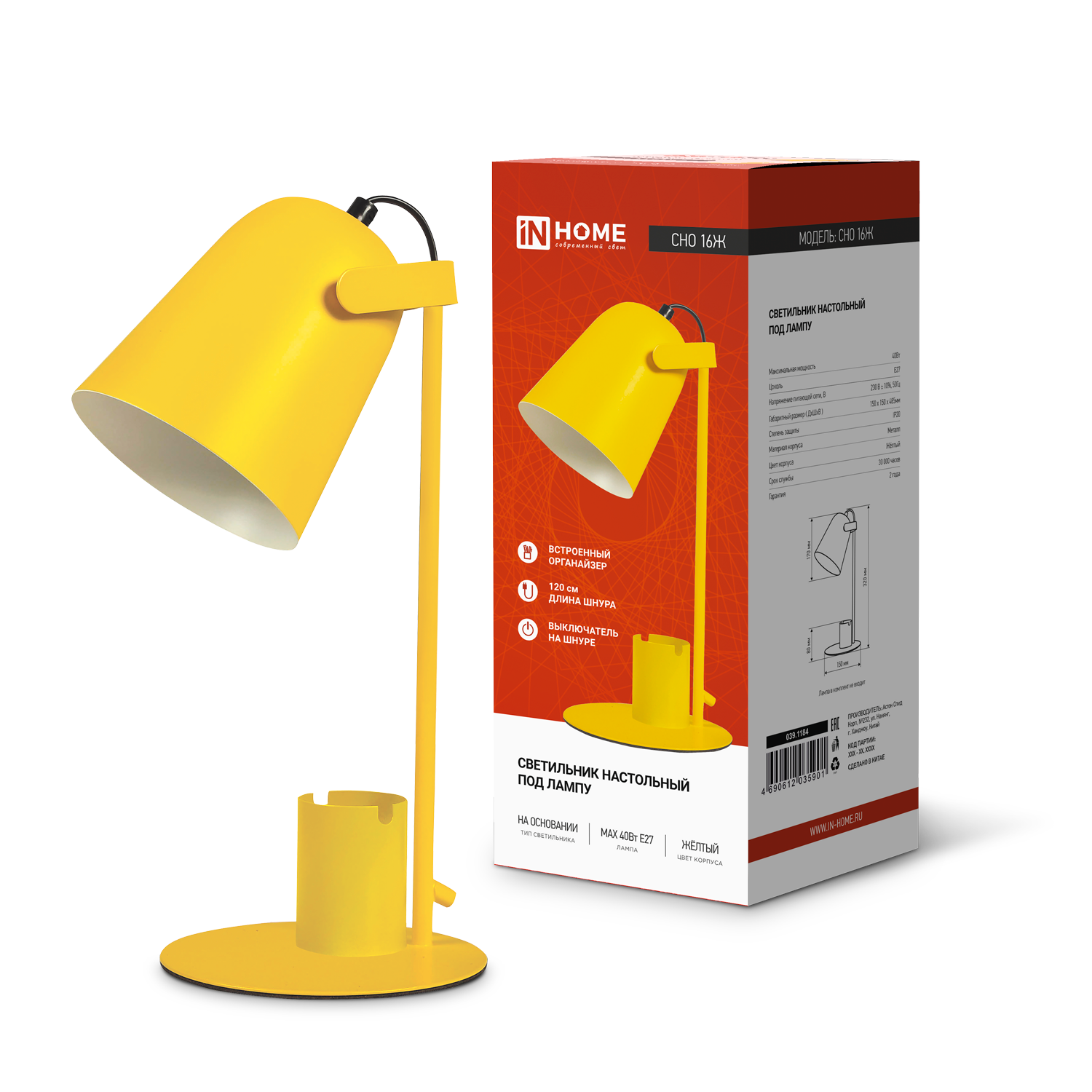 Светильник настольный под лампу на основании СНО 16Ж 40Вт E27 230В с органайзером ЖЕЛТЫЙ IN HOME