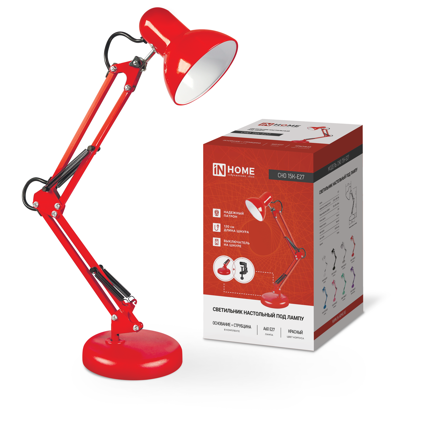 Светильник настольный СНО 15К-E27 IN HOME — надежная настольная лампа с комбинированным креплением (основание и струбцина), предназначенная для создания эффективного локального освещения рабочего пространства. Модель оснащена стандартным цоколем E27 и рассчитана на использование ламп мощностью до 60 Вт, что позволяет обеспечить оптимальный уровень освещенности для работы, учебы, чтения и других задач.