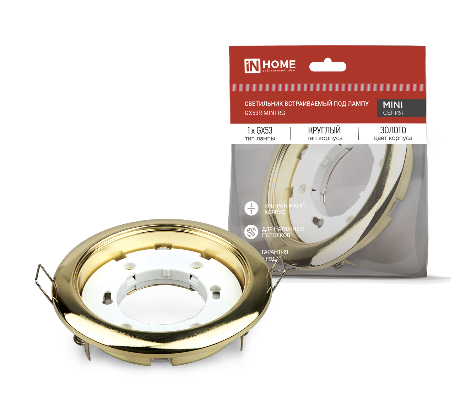 Встраиваемый светильник IN HOME серии GX53R-RG-mini под лампу GX53 предназначен для работы в сетях переменного тока 230 В. Представляет собой отличную замену точечным светильникам под зеркальные и галогенные лампы рефлекторного типа. Ультратонкая модель с минимальным нагревом идеально подходит для установки в подвесные и натяжные потолочные конструкции, а также в шкафы-купе, кухни, витрины, прилавки и пр. Не имеет «заднего света», что особенно важно для полупрозрачных натяжных потолков. При установке на пластиковую или деревянную поверхность не требует дополнительной теплоизоляции. Успешно используется для освещения жилых и общественных помещений, офисных зданий, торговых комплексов, кафе, ресторанов и т.д. Подходит для основных и вспомогательных мест общего пользования (коридоры, лестничные пролеты, столовые, конференц-залы, спортзалы и др.). Материал корпуса – прочный качественный пластик. Линейка встраиваемых светильников GX53R-mini представлена в золотом, хромированном и белом вариантах корпуса. Может работать со светодиодными лампами GX53 мощностью от 2 Вт до 13 Вт с цветовой температурой от 2700 К до 6400 К. Гарантия 2 года.