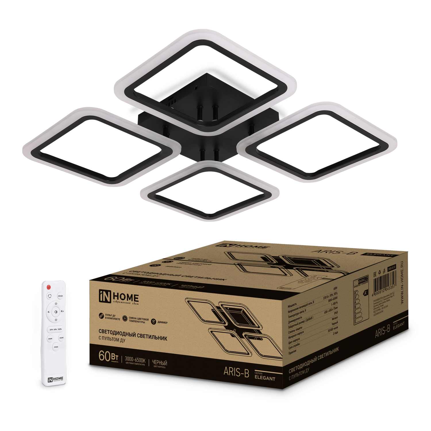 Светильник светодиодный ELEGANT ARIS-B 60Вт 230В 3000-6500K 4700Лм 450х450х75мм c пультом ДУ черный IN HOME