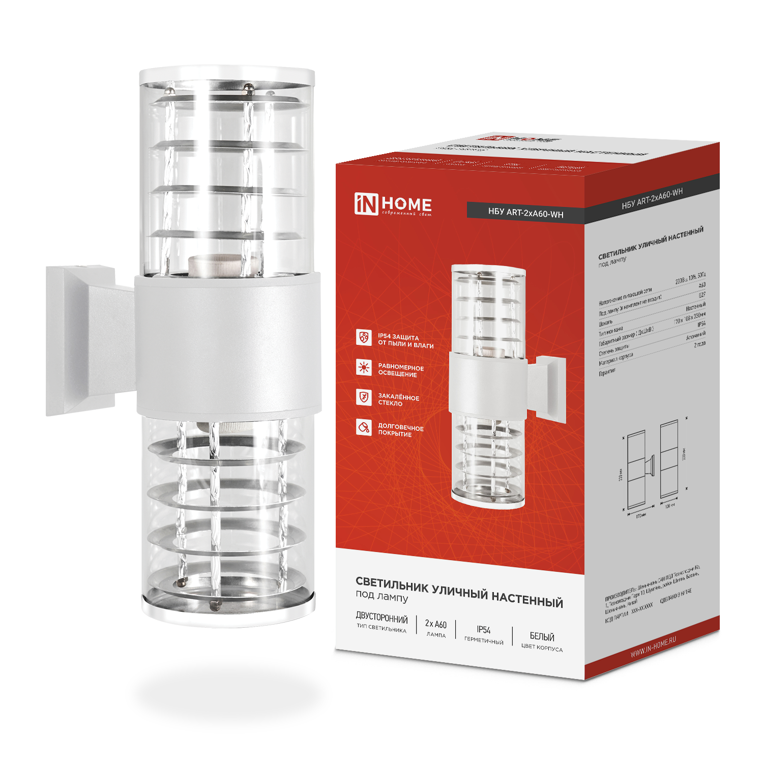 Светильник уличный настенный двусторонний НБУ ART-2хA60-WH IN HOME предназначен для фасадной подсветки загородных домов, коттеджей и коммерческих объектов. Двусторонняя конструкция формирует направленный свет вверх и вниз, создавая выразительный архитектурный эффект.