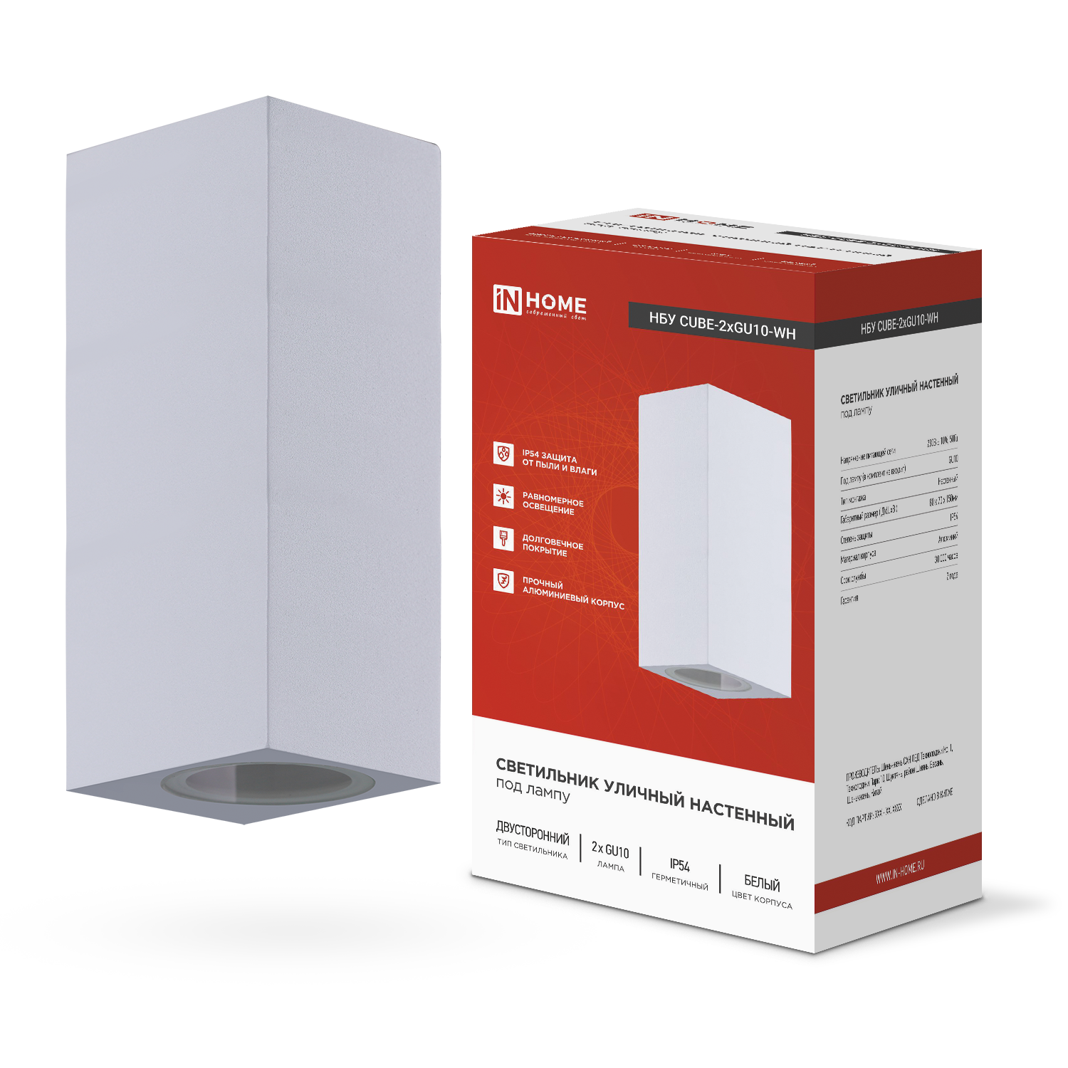 Уличный светильник CUBE-2хGU10-WH IN HOME — практичное и стильное решение для создания современной фасадной подсветки и архитектурного освещения.