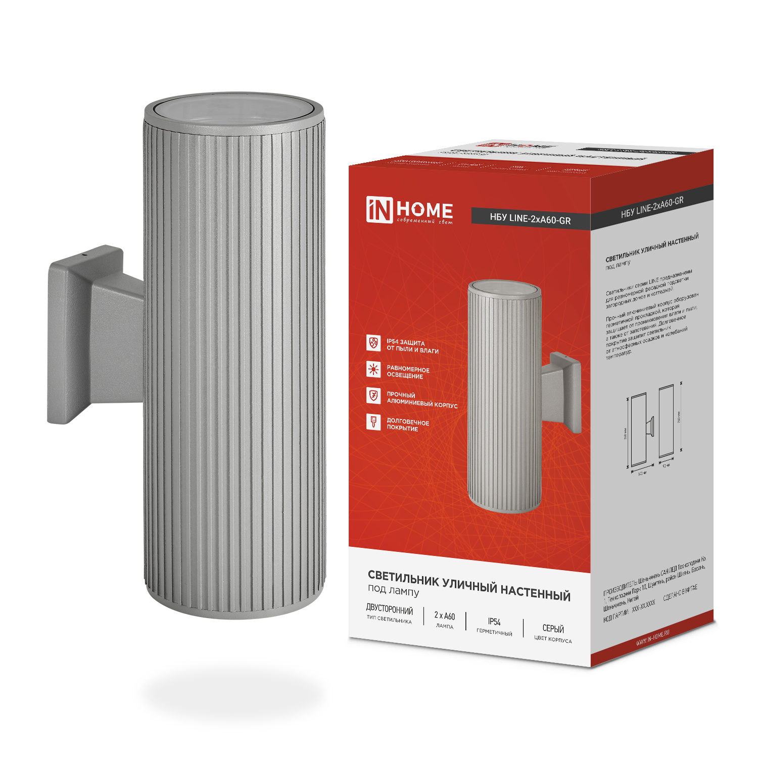 Светильник уличный настенный двусторонний НБУ LINE-2xA60-GR IN HOME предназначен для фасадной подсветки загородных домов, коттеджей и коммерческих зданий. Двусторонняя конструкция обеспечивает равномерное распределение света вверх и вниз, создавая выразительный архитектурный эффект.