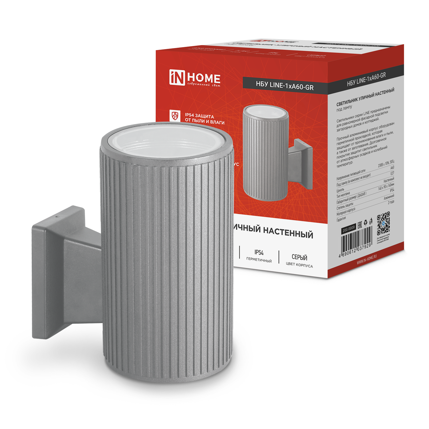Светильник уличный настенный односторонний НБУ LINE-1хA60-GR IN HOME — современное решение для фасадного и акцентного освещения частных и коммерческих объектов. Модель предназначена для работы со светодиодными лампами с цоколем E27 и подходит для подсветки загородных домов, коттеджей, ресторанов, террас, входных групп и архитектурных элементов.