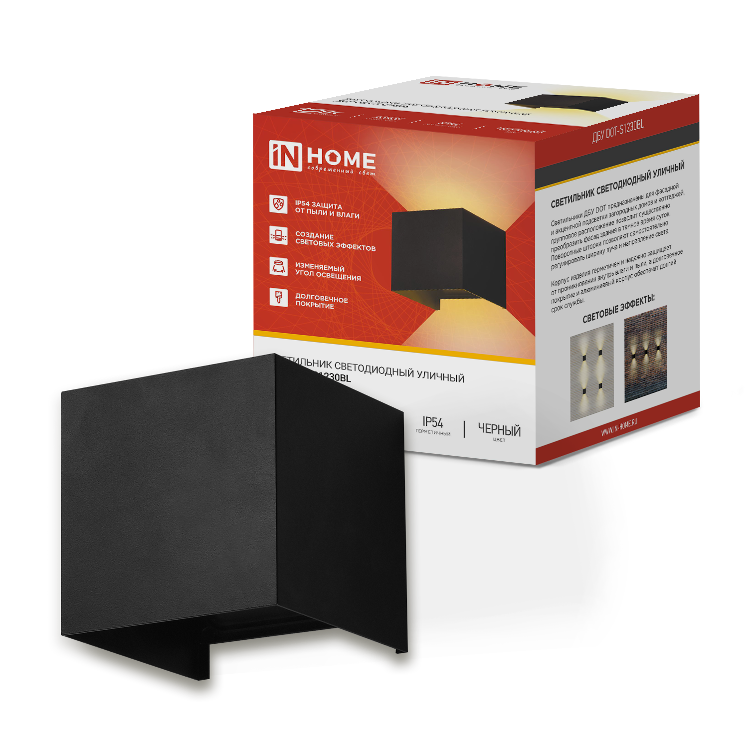 Светильник уличный светодиодный ДБУ DOT-S12B IN HOME — современное решение для фасадного и декоративного освещения загородных домов, коттеджей и коммерческих объектов. Компактная квадратная форма и направленный свет позволяют создавать выразительные световые акценты на архитектурных элементах.